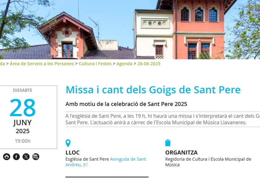 Missa i cant dels Goigs de Sant Pere, programació el 28 de juny de 2025 a Llavaneres.